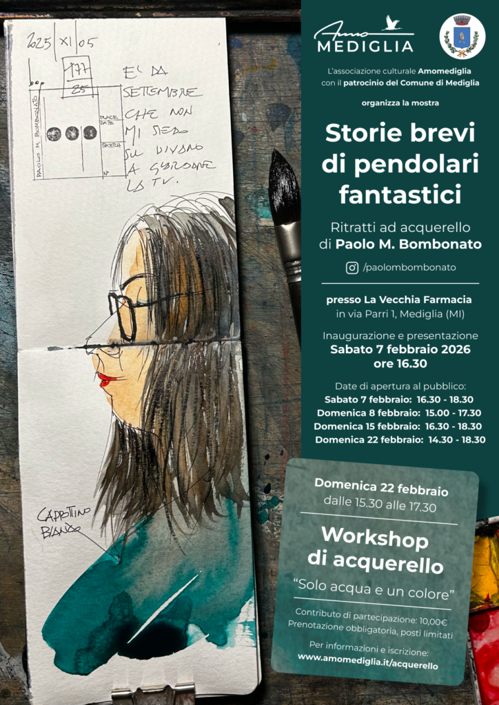 Con il patrocinio del Comune di Mediglia, arriva anche a Mediglia, per la prima volta, la mostra personale dell’architetto Paolo M. Bombonato dall’intrigante titolo “Storie brevi di pendolari fantastici”: ritratti ad acquerello che raccontano storie di centinaia di persone incrociate dall’artista sui vagoni di Ferrovie Nord, tra Meda e Milano e ritorno.