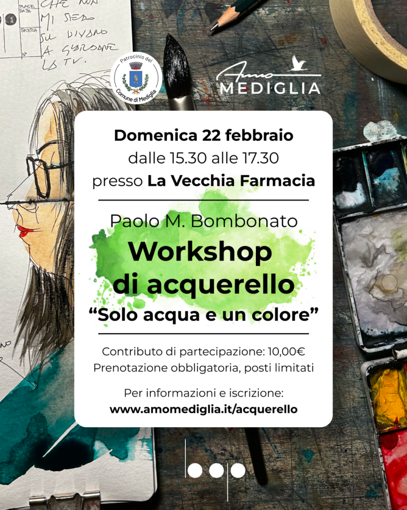 Amomediglia, con il patrocinio del Comune di Mediglia, propone per domenica 22 febbraio, dalle 15.30 alle 17.30, durante l’ultima giornata di apertura della mostra Storie brevi di pendolari fantastici, un Workshop di acquerello dal titolo “Solo acqua e un colore” tenuto dall’artista Paolo Bombonato.